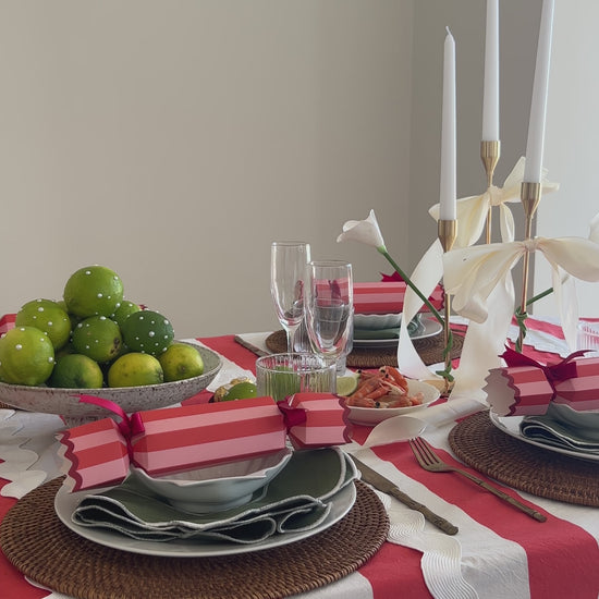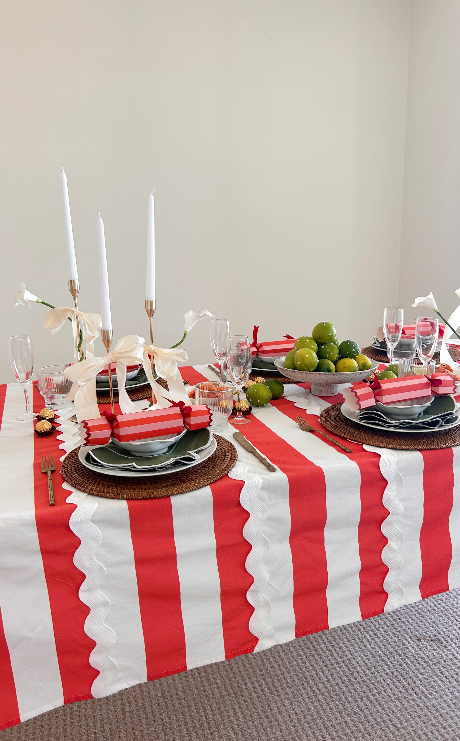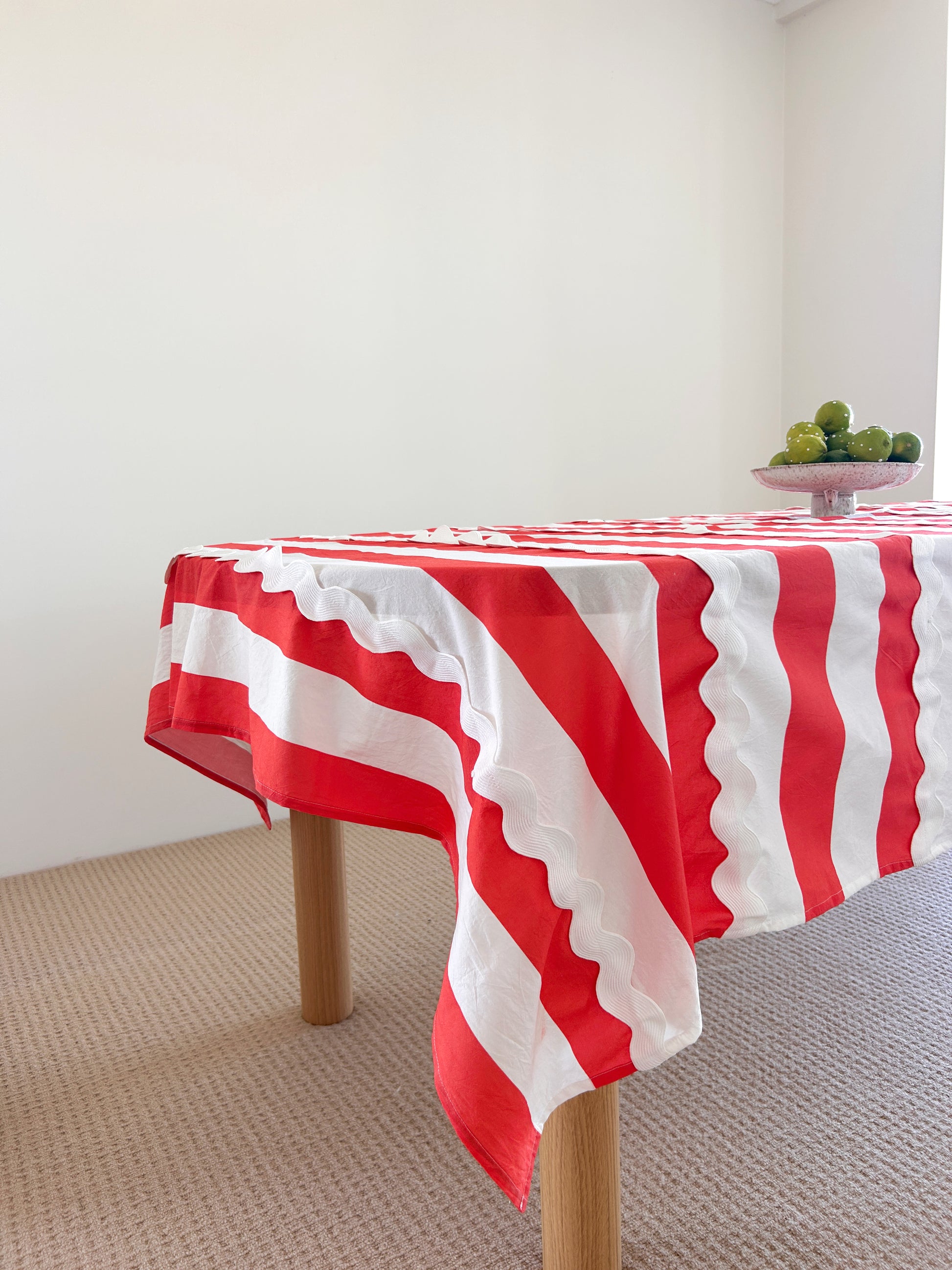 Meet Bianca. She’s bold stripes, ric-rac drama, and unapologetic flair wrapped up in one tablecloth. Think candy cane chic meets Aperol in hand host, the one who shows up overdressed and somehow convinces everyone else to kick off their shoes.