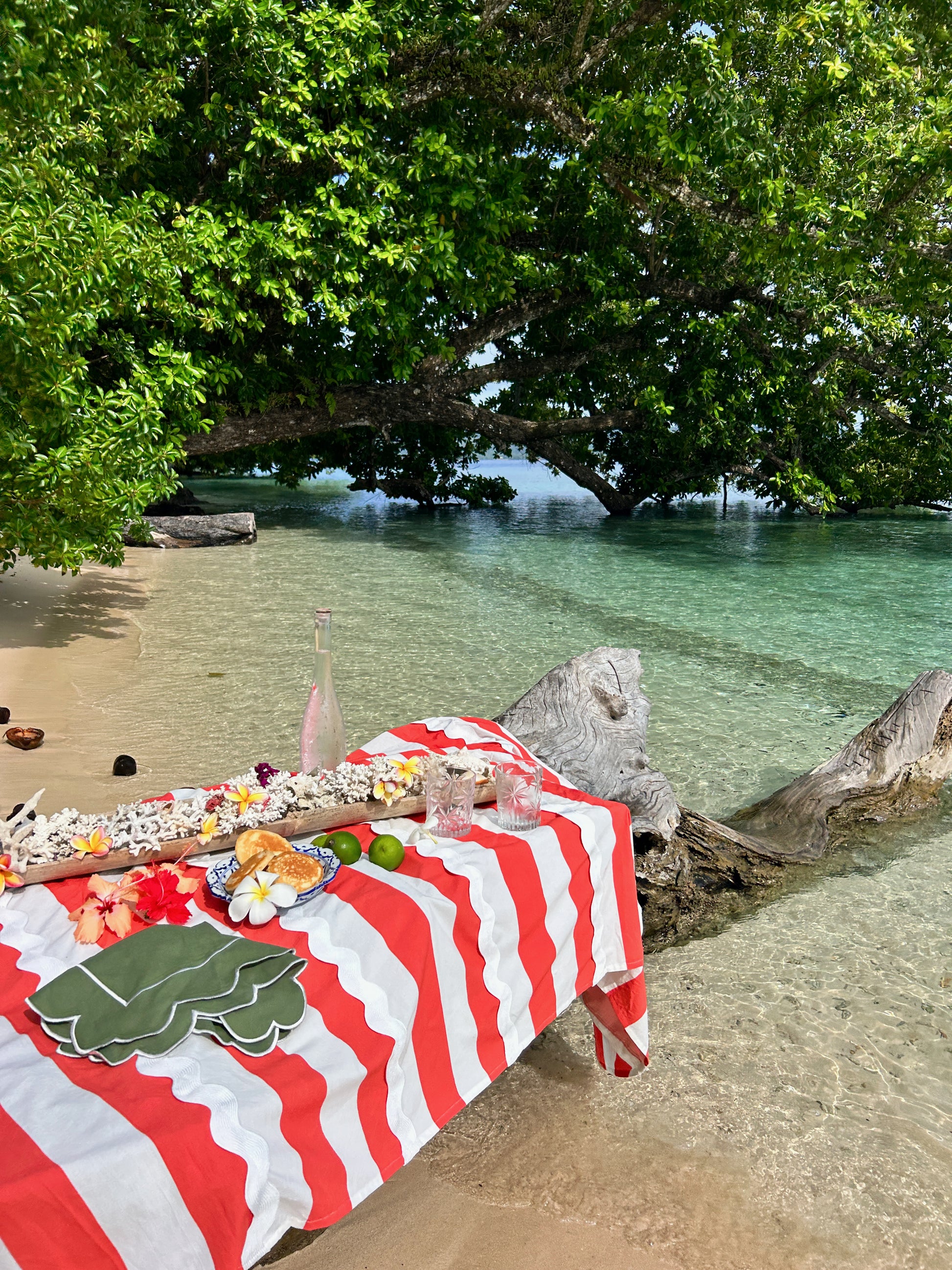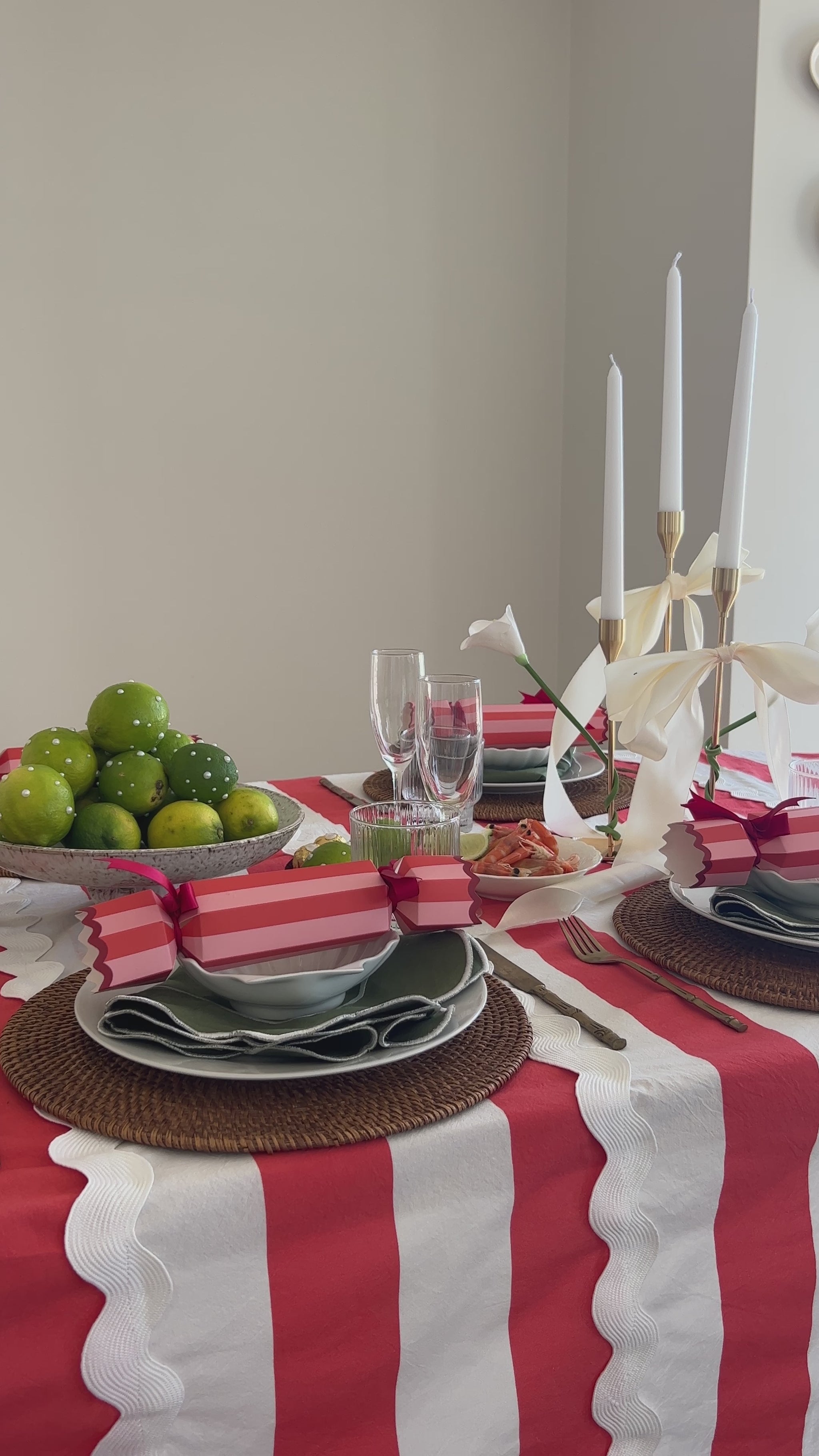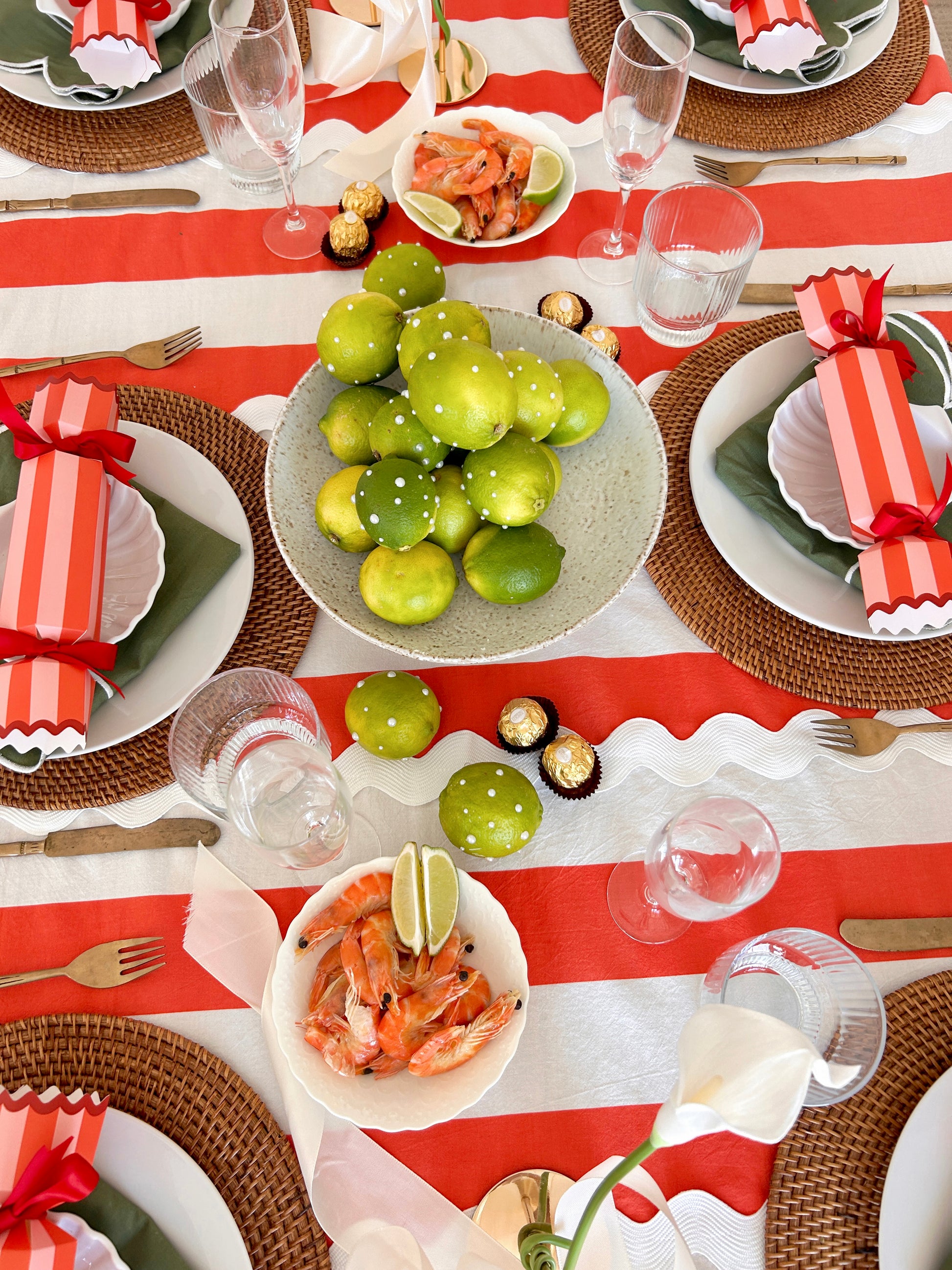 Meet Bianca. She’s bold stripes, ric-rac drama, and unapologetic flair wrapped up in one tablecloth. Think candy cane chic meets Aperol in hand host, the one who shows up overdressed and somehow convinces everyone else to kick off their shoes.